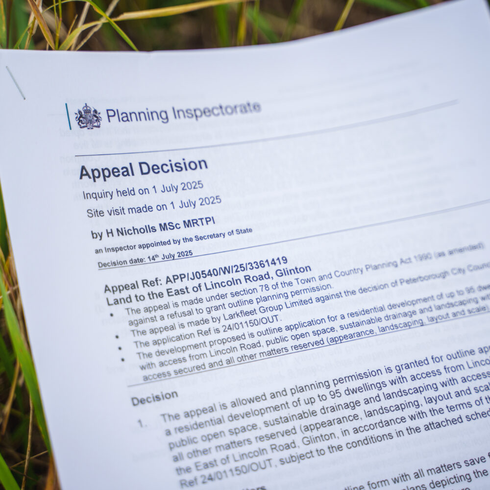 We’ve overcome several challenges to achieve planning permission on this 11-acre site on the edge of the village of Glinton, Peterborough. Responding to the landowners wishes by purchasing the site outright in 2019, before securing planning at appeal in July 2025.